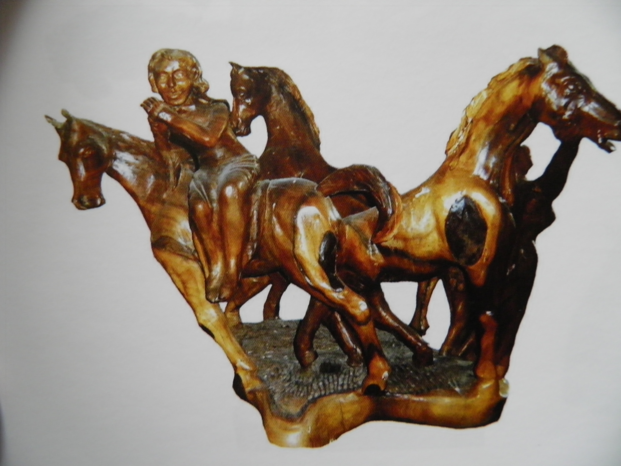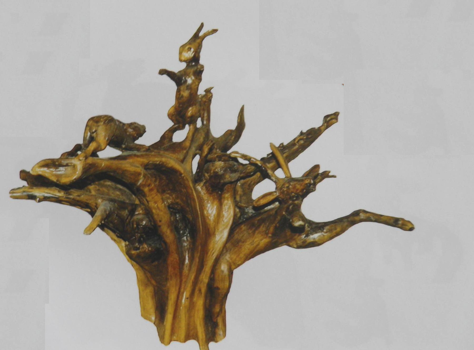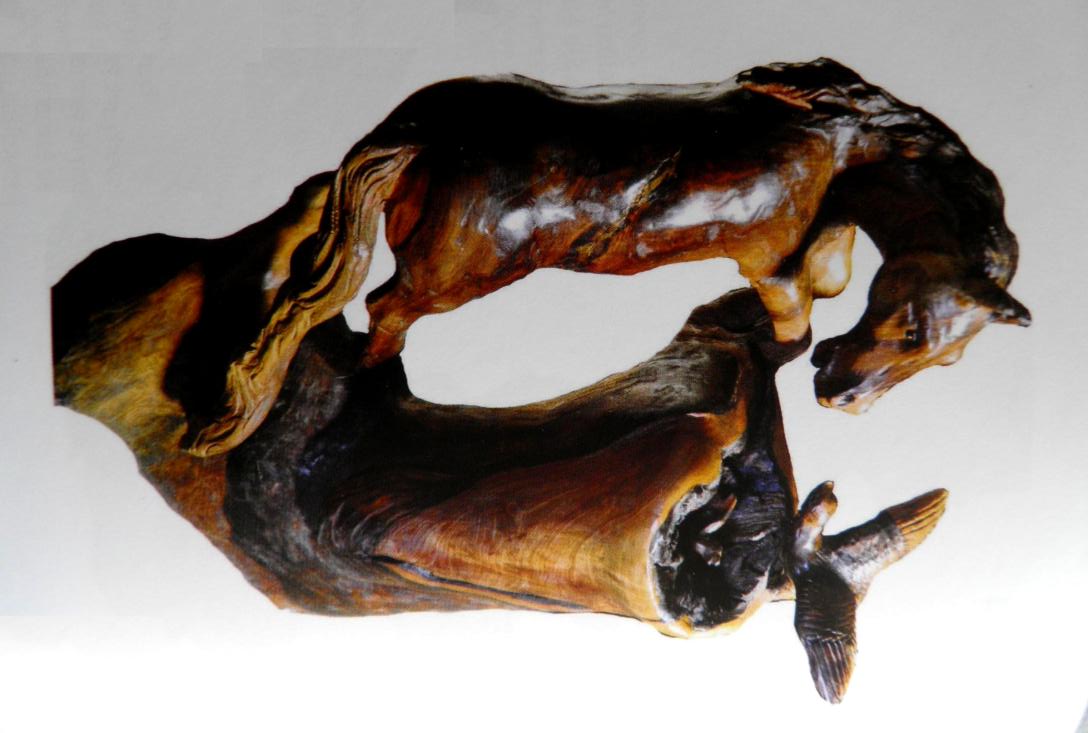 René Prestat commence par observer la souche à l'état brut sa forme, ses tourments, les racines inversées s' il faut, et il va déceler peut être l'ébauche d' un cerf, d'un oiseau, dans une ombre ou un contour ..