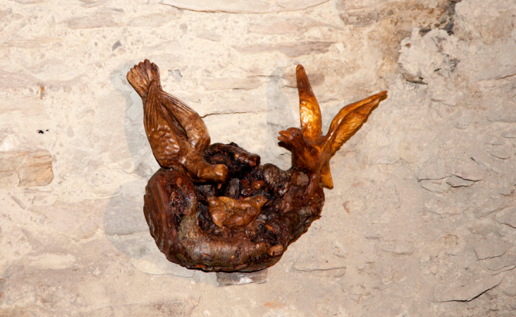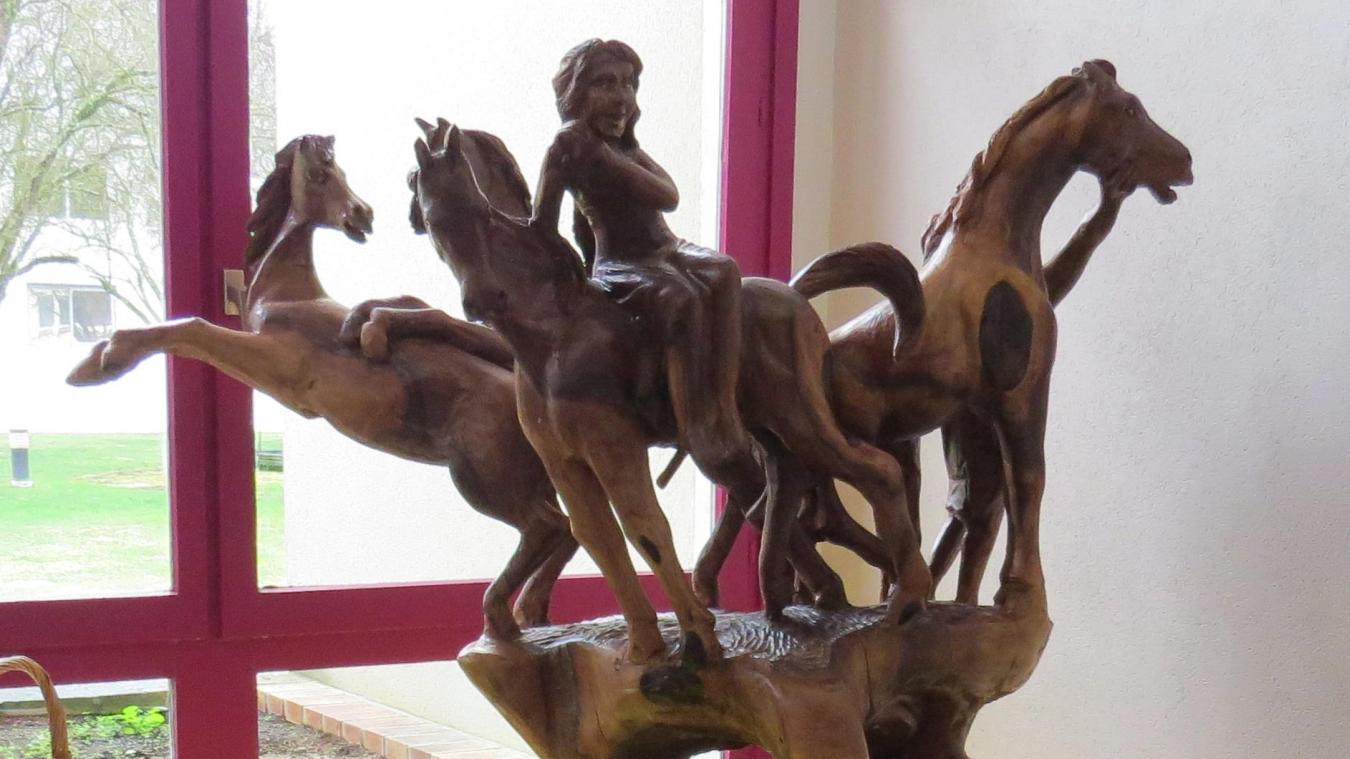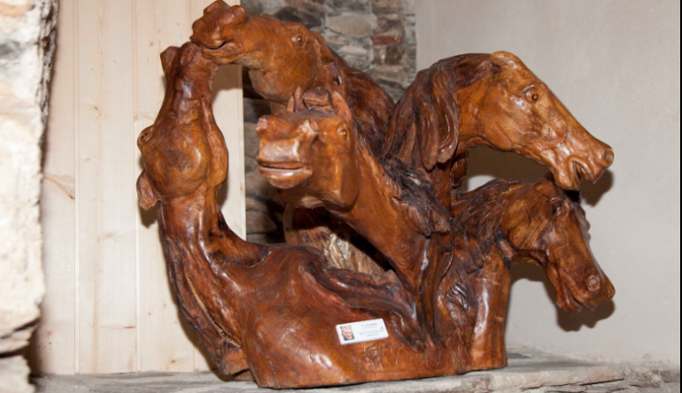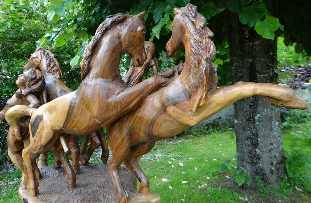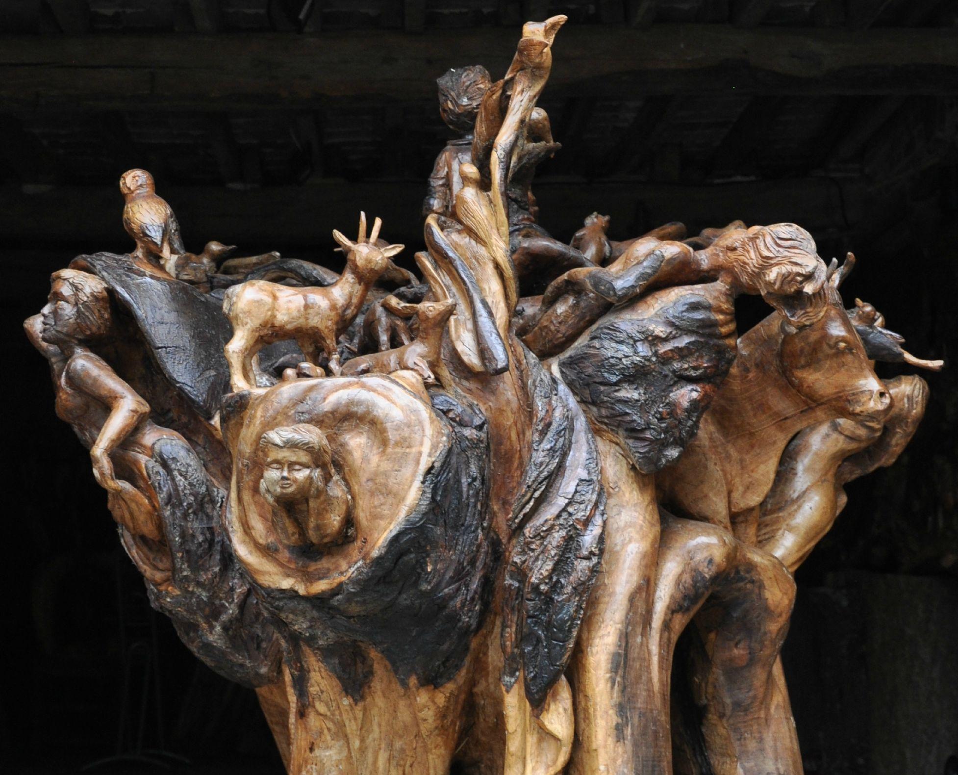 René Prestat commence par observer la souche à l'état brut sa forme, ses tourments, les racines inversées s' il faut, et il va déceler peut être l'ébauche d' un cerf, d'un oiseau, dans une ombre ou un contour ..