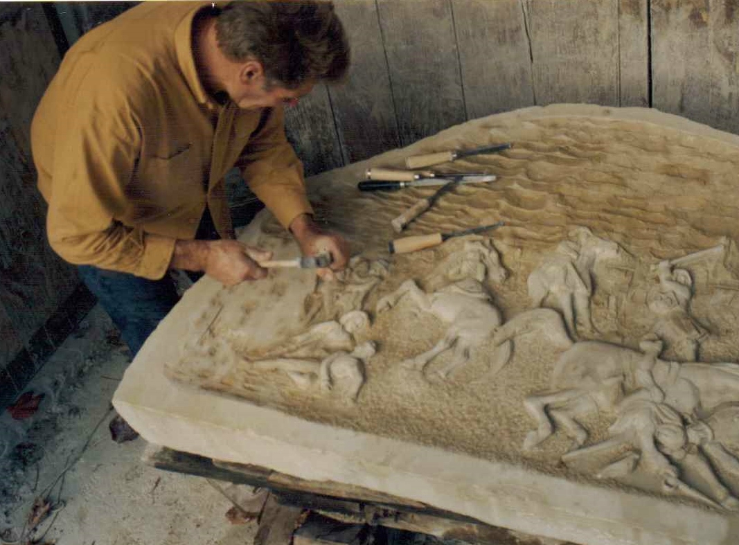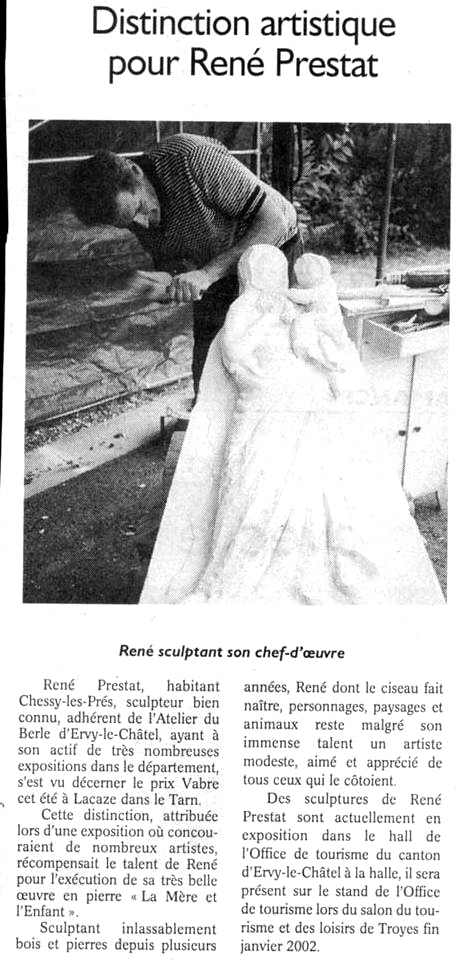 René Prestat travaille aussi la pierre , Les statues de saints dans les eglises, la Mythologie, l histoire les armoiries.. on l'a vu pour la restauration du domaine de la "Feulie notamment Avec le four à pain qu'il a restauré, des grandes pierres sculptées représentent des scènes champêtres, tandis que sur la façade des gargouilles selon l'esprit de l'époque, protègent l'habitation des esprits du mal. la restauration des monuments historiques comme la statues de StNicolas a Ervy-le-châtel, et d'autres projets en cours voir les actualités de René.